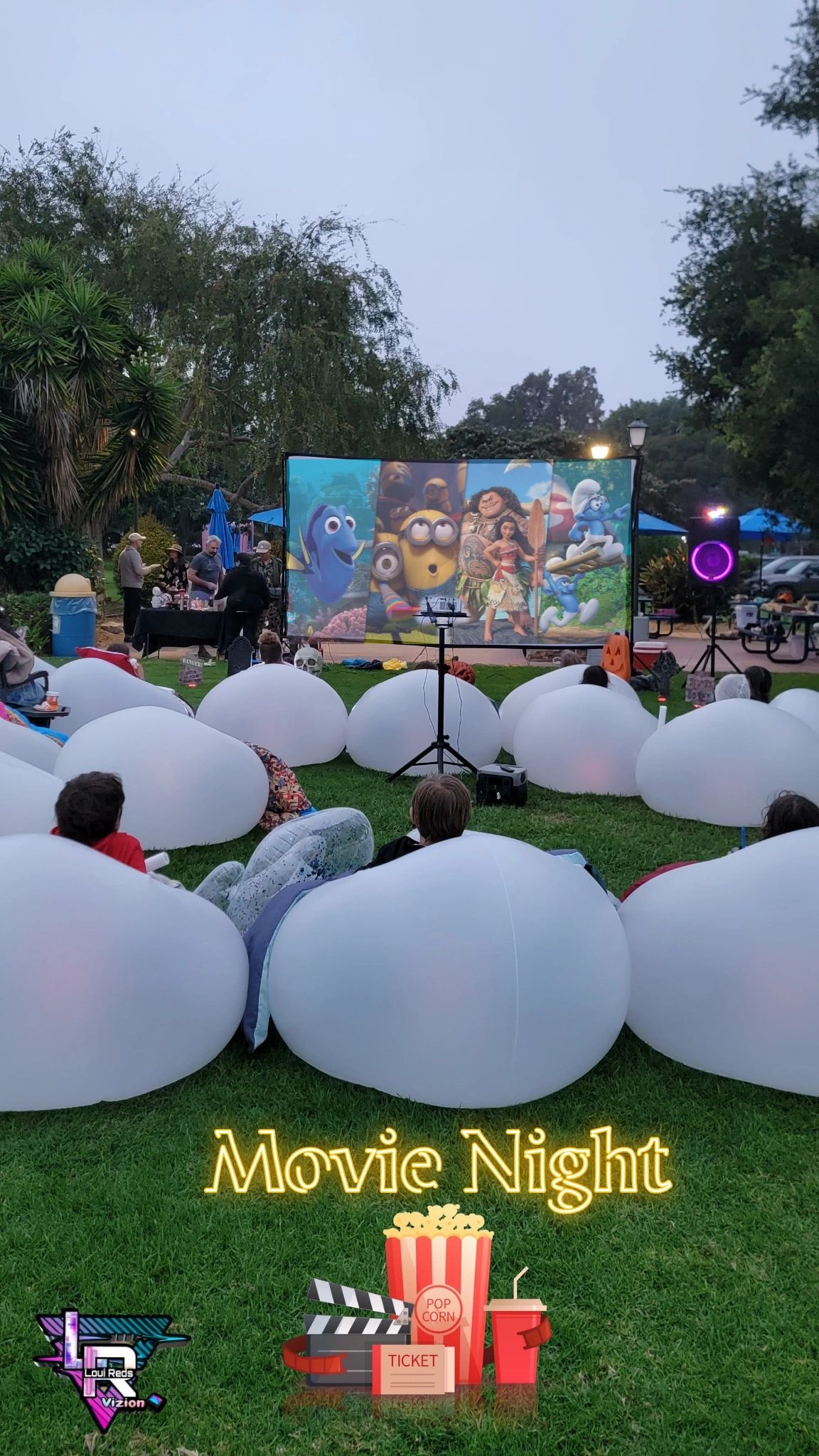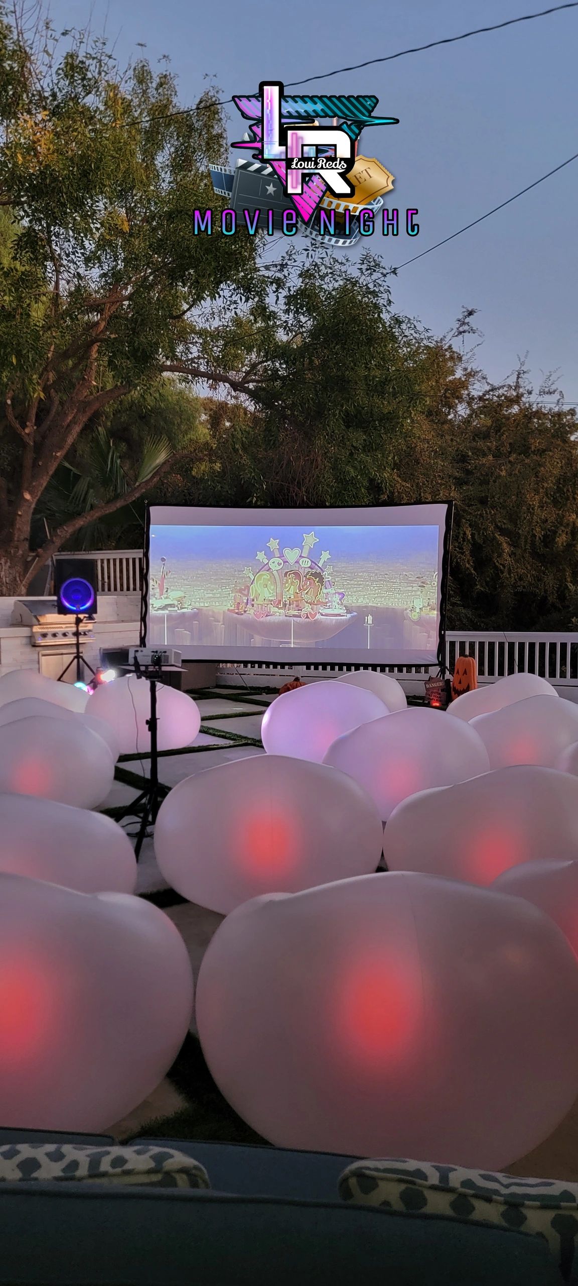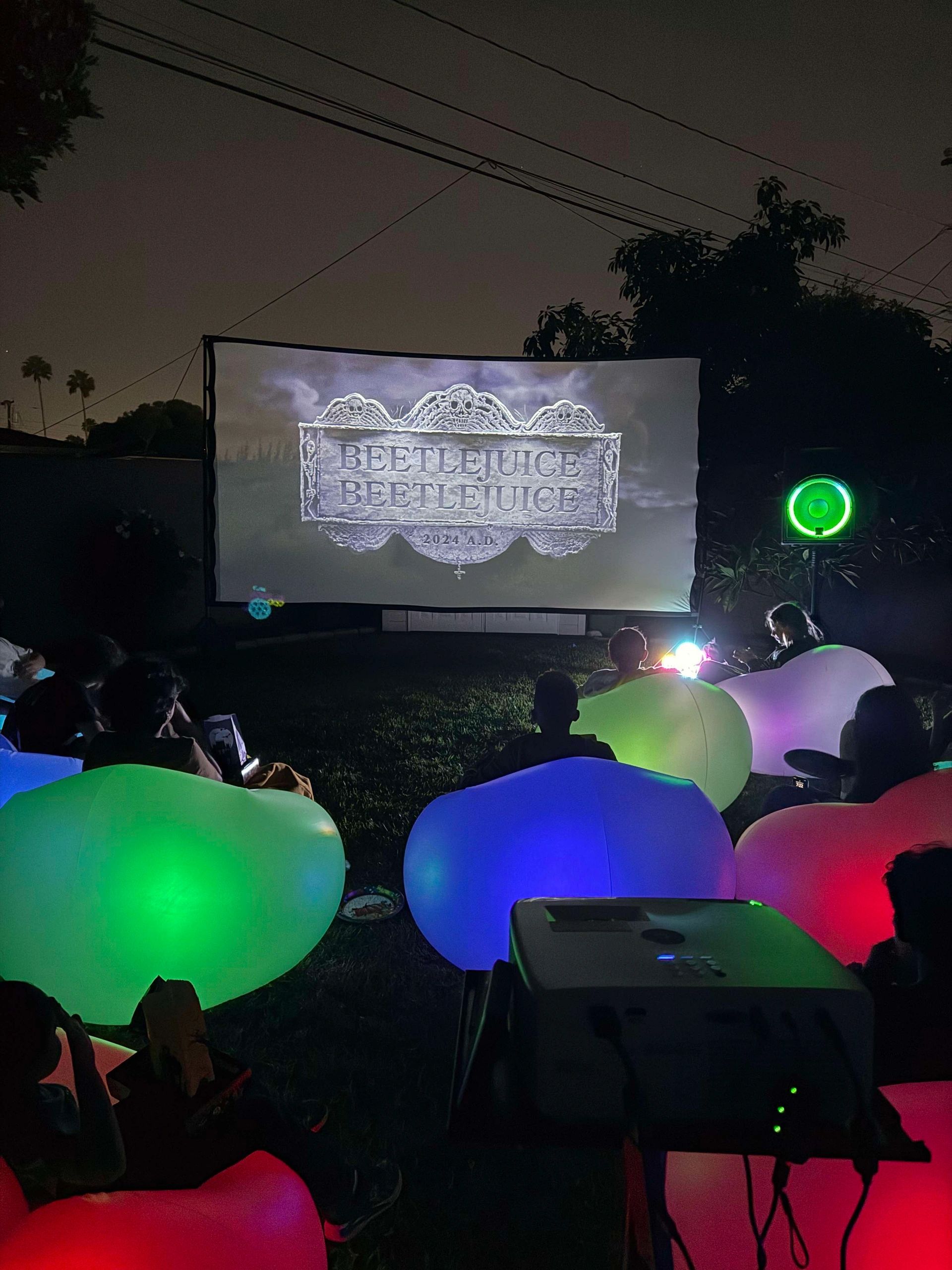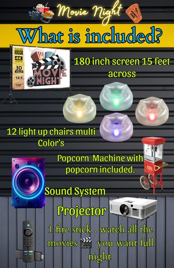 POPCORN MACHINE, 12 INFLATABLE LIGHT UP CHAIRS , 180 INCH SCREEN , BIG SPEAKER MULTICOLORED LIGHTS, PROJECTOR AND A BIG LIBRARY OF MOVIES TO WATCH .